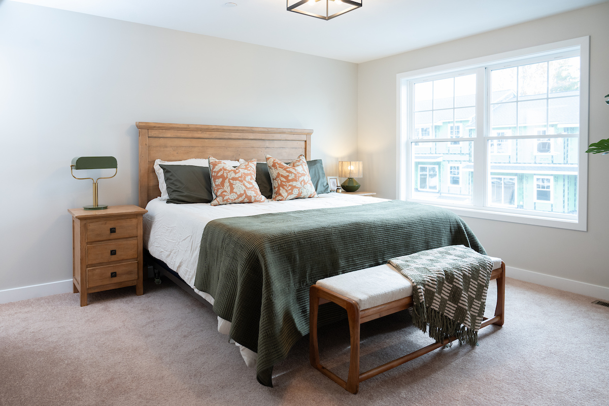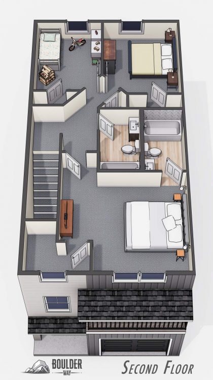 The Boulder Way townhouse community offers 3-bedroom, 2.5-bathroom floor plans. Modern features provide an exceptional living experience, such as a dedicated laundry room on the main living level which features installed washer and dryer, a countertop for folding laundry, shelving, and space to hang clothes to dry.